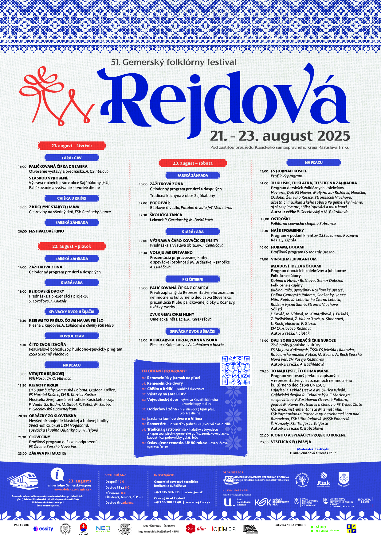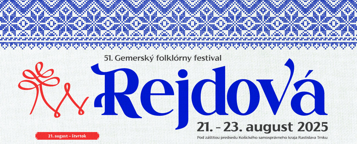 Obec Rejdová sa opäť stane srdcom folklóru – od 21. do 23. augusta 2025 privíta 51. ročník Gemerského folklórneho festivalu, ktorý po úspešnom jubileu vstupuje do druhej polstoročnice svojej existencie. V aktuálnom ročníku sa festival tematicky zameriava na živé prvky tradičnej kultúry, ktoré sú zapísané v Reprezentatívnom zozname nehmotného kultúrneho dedičstva Slovenska a UNESCO. Práve ich predstavenie bude pretkané celým programom – od scénických vystúpení, cez výstavy a prednášky, až po tvorivé dielne a interaktívne prezentácie.